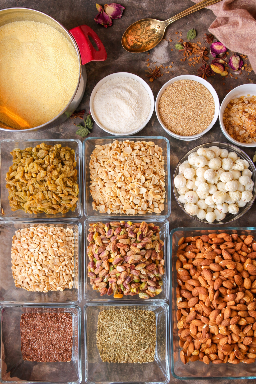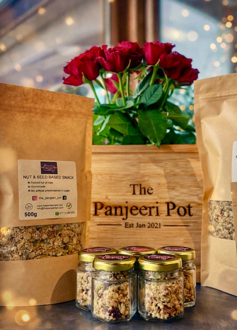 Panjeeri is a nut and seed based snack made with semolina and ghee (clarified butter). It is all homemade and fresh for every customer. I don't scrimp on nuts and seeds, which is where the benefits lie. A super versatile superfood, like energy balls in loose form so you can eat it in many ways.